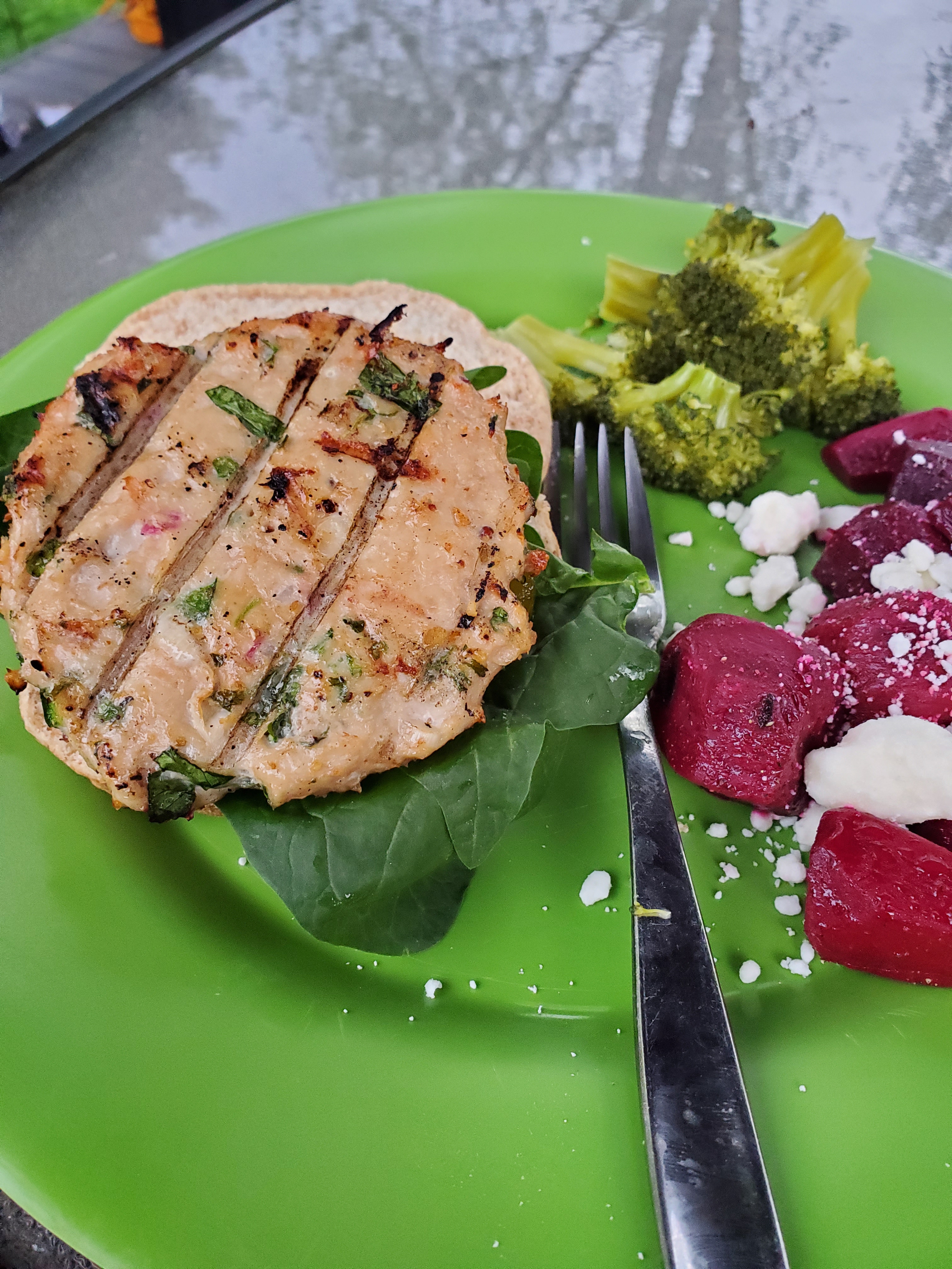 Form into 4 patties and grill. Be sure that chicken is cooked through before serving. ENJOY this clean and tasty dish! We had them tonight with broccoli and beets with feta. A PERFECT summer dinner.