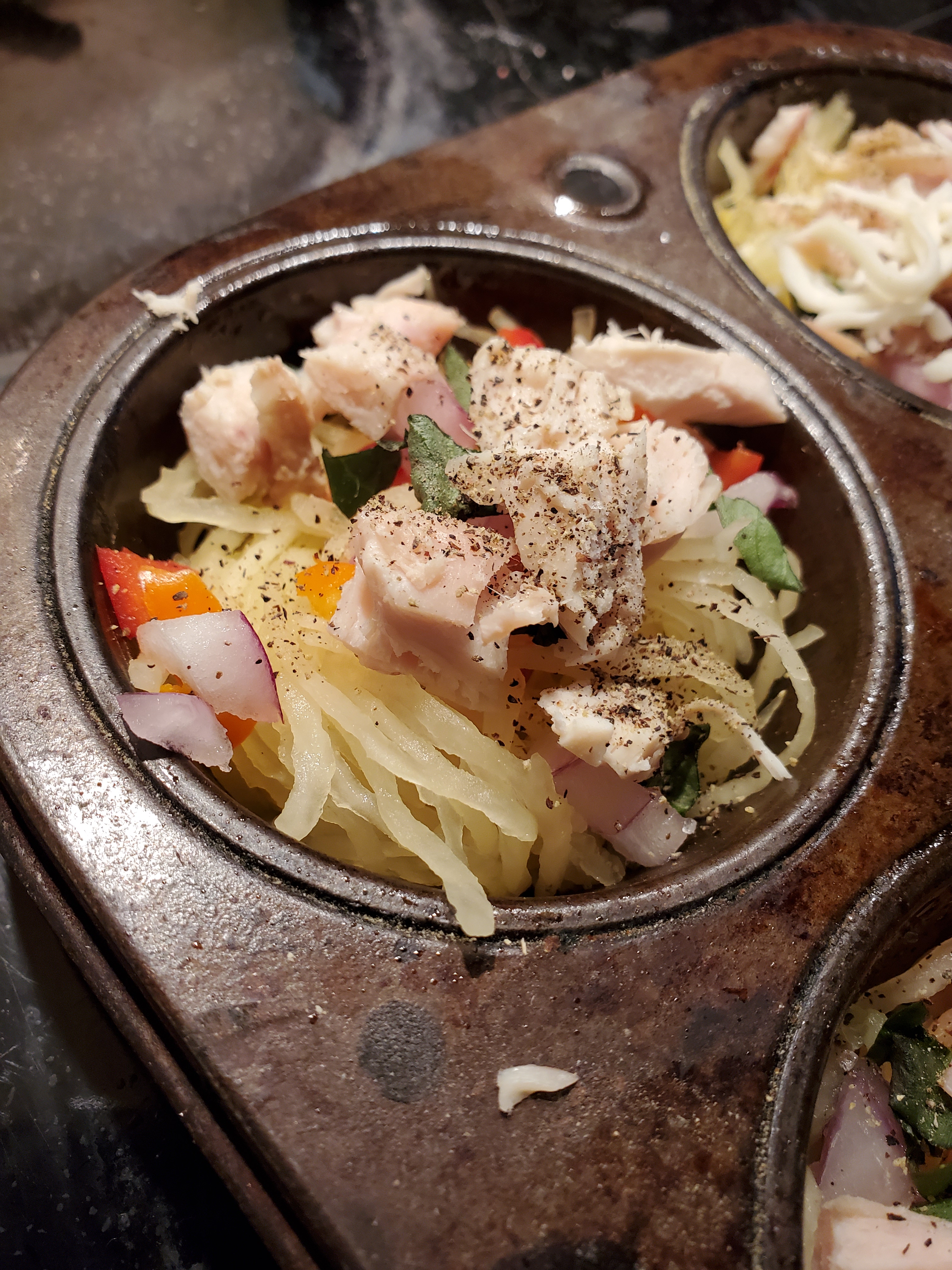 Fill tins about 1/2 -1/3 full with cooked spaghetti squash.