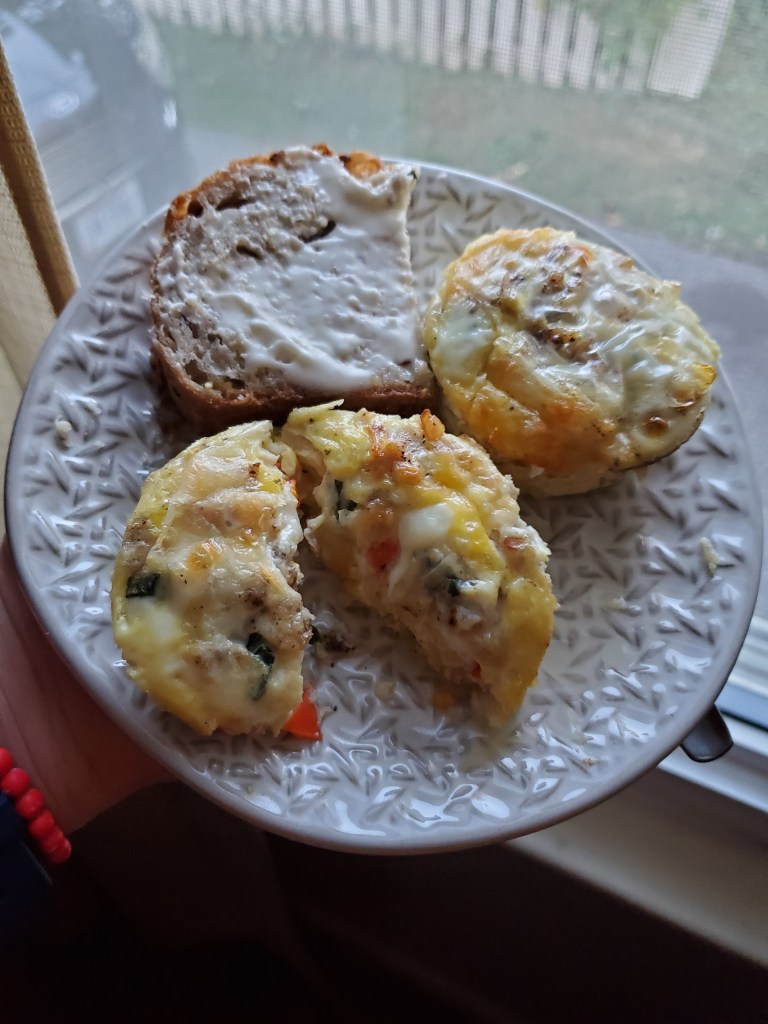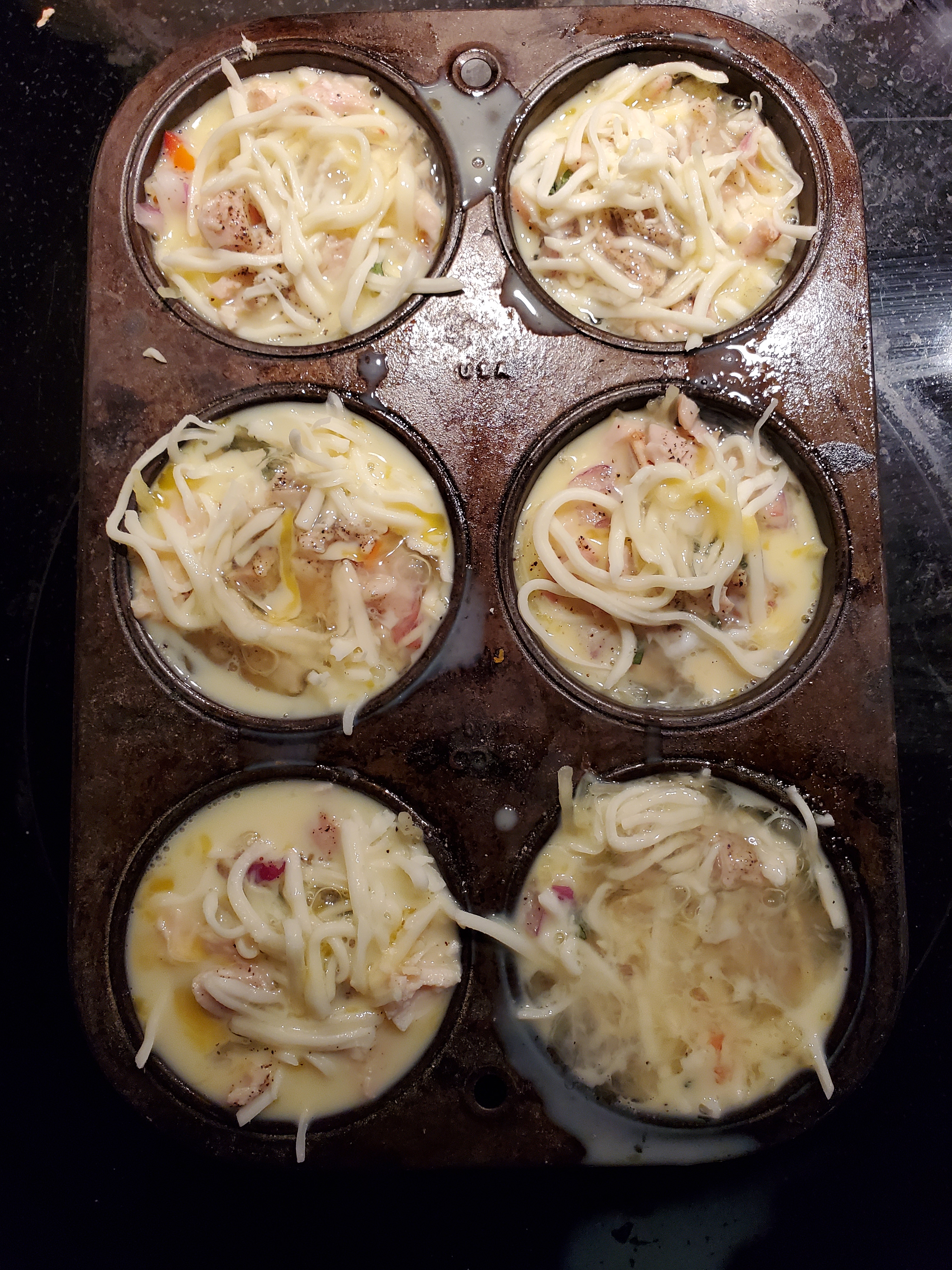 Beat together eggs and milk as you would to make scrambled eggs. For 6 muffin tins I used 4 eggs and enough milk to make about 2 cups of mixture. Pour over cups just to fill each tin. Bake at 350 for about 25 min or until the tops of your muffins look done. Oven time will vary; the squash adds moisture, cheese melts, and the consistency of your egg mixture will change things. Just keep an eye on your cups towards the end.