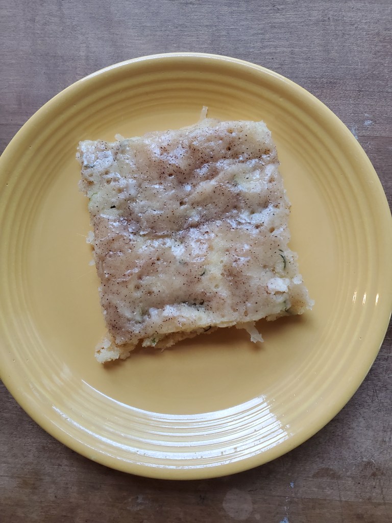 How about a YUMMY new recipe? This recipe is one I cherish from my childhood, and wherever my mom found it, I’m glad she did. It’s a different twist on most zucchini bars, with their spices and cream cheese. This is simple and sweet, with a light cinnamon glaze on top. Plus, it has coconut, so the summer flavor can’t be beat! I remember she used to make it for our family reunions or summer birthday parties since it makes a lot. This recipe is full of sentiment for me, and I’m posting it for that reason. I mean, there’s mental fitness in those childhood memories, right? 😉